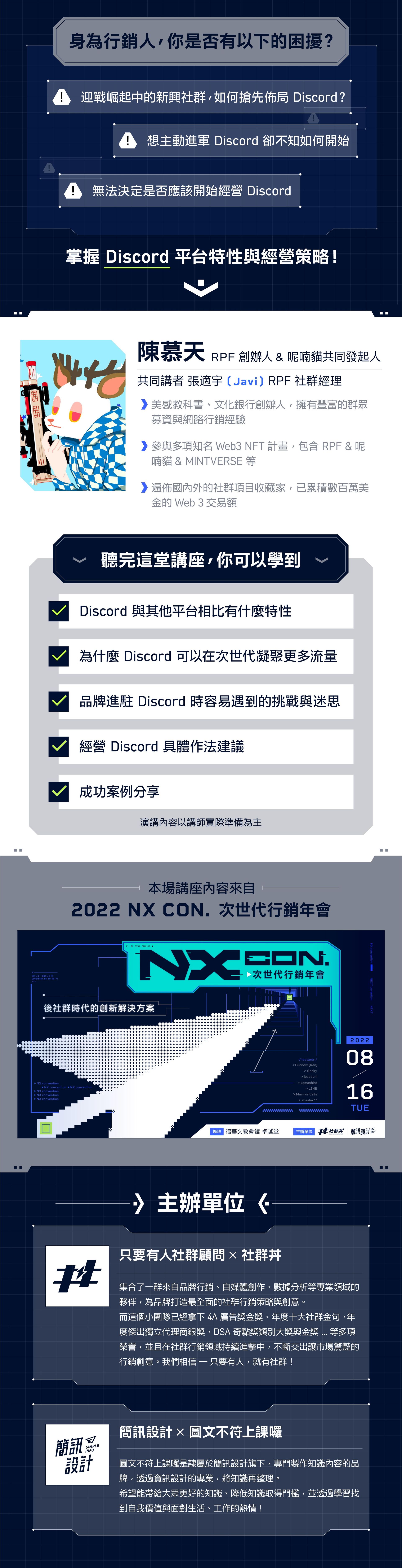 迎戰崛起中的新興社群, 如何搶先佈局Discord?|2022 NX CON. 次世代行銷年會 |呢喃貓&RPF 共同創辦人Swi 陳慕天 & RPF 社群經理 張適宇