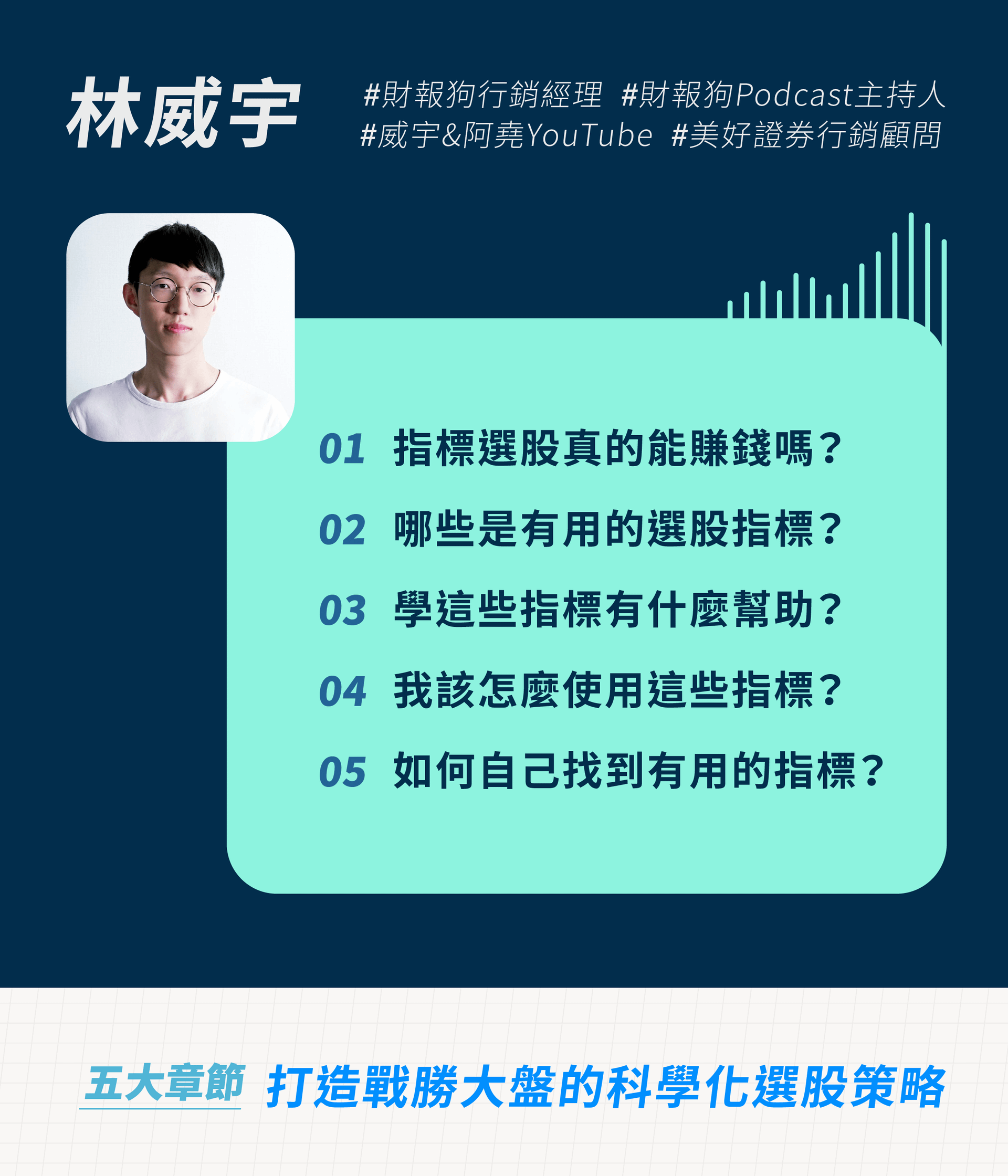 現任財報狗產品經理、財報狗 Podcast 主持人和美好金融行銷顧問。 擅長產品規劃、產品成長行銷和數據分析。 投資風格屬於基本面投資人,經營「威宇 & 阿堯」YouTube 頻道,分享國外基金經理人觀點和商業分析內容;以及組織「財報狗學院」投資人社群,聚集專業投資人和產業人士互相交流。 曾接受過智富、今周刊、鏡週刊、週刊王等財經媒體專訪過,也經常受到證券研究社、研究報告評鑑、社會人士投資社團等邀請作為講師。