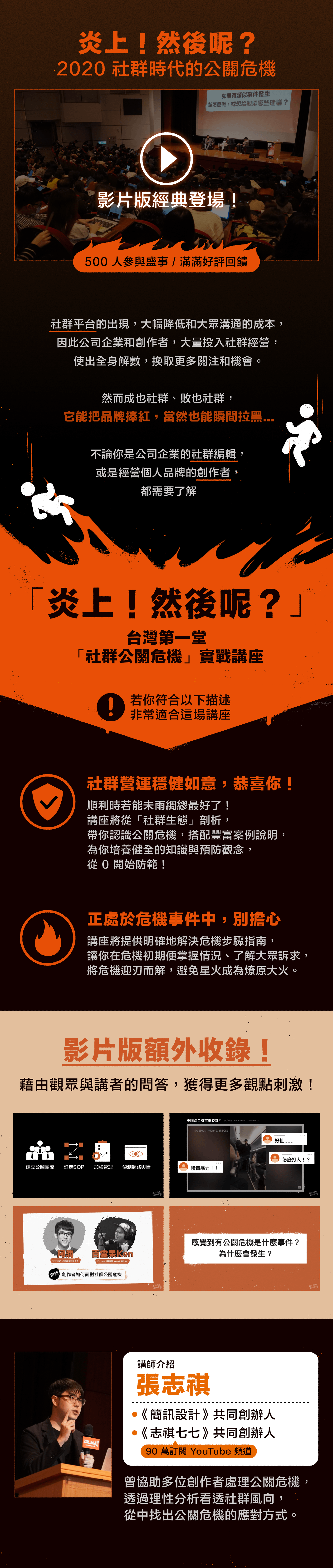 ※本講座為 2020.12.9 線下舉辦的實體講座(炎上!然後呢? 2020 社群時代的公關危機),將志祺場次的內容重新整理,錄製成線上講座版,講座影片將於 9/10 正式上架。